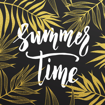 夏の時間のシュロの葉パターン カード 手には 金の文字が描かれました 書道と夏の黄金背景の壁紙 キラキラ のヤシの葉のパターンは 旅行の夏のポスター ベクター画像の壁紙 のイラスト素材 ベクタ Image